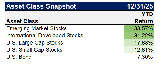 Which brings me to my next train of thought on 2025. International stocks rocked it! Emerging markets and international developed stocks were both up around 30%. We’ve long been believers in global diversification, and 2025 was another great example of its many benefits. This trend has carried over into 2026 so far as well.
